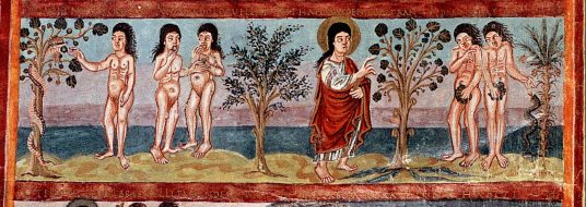 蛇是主上帝所創造的動物中最狡猾的。蛇問那女人:「上帝真的禁止你們吃園子裡任何果樹的果子嗎?」那女人回答:「園子裡任何樹的果子我們都可以吃;只有園子中間那棵樹的果子不可吃。上帝禁止我們吃那棵樹的果子,甚至禁止我們摸它;如果不聽從,我們一定死亡。」 蛇回答:「不見得吧!你們不會死。上帝這樣說,因為他知道你們一吃了那果子,眼就開了;你們會像上帝一樣能夠辨別善惡。」那女人看見那棵樹的果子好看好吃,又能得智慧,很是羨慕。她摘下果子,自己吃了,又給他丈夫吃;他丈夫也吃了。他們一吃了那果子,眼就開了,發現自己赤身露體;因此,他們編了無花果樹的葉子來遮蓋身體。(GEN III, 1-7)