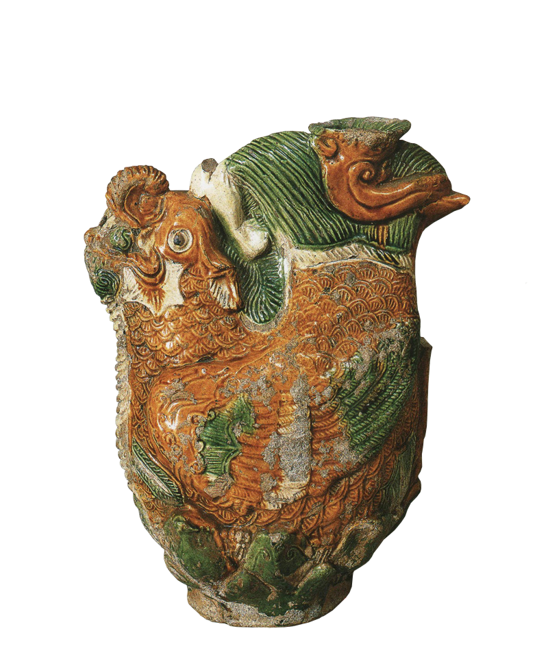 1981年內蒙古寧城縣出土了一件〈遼三彩摩羯壺〉【圖 4】,這件遼瓷是龍首魚身的摩羯造型,施黃、綠、白三色釉,通體浮雕魚鱗,臥於八瓣仰蓮之上。龍首唇部向上翻捲,口中含有一珠穿孔為流,口流十分細小,推測為陪葬明器。腹身兩側有翼,雙翼根部浮雕傘形胸鰭,魚尾下部有扁狀枝莖為器把。