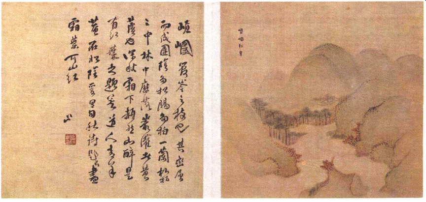 崛圍山是管涔山的延伸,也是呂梁山脈的支系。管涔山處於寧武、岢嵐、五寨等縣的交界處,也是貫穿山右全境的汾河水之源頭。而崛圍山因嶂巒彎曲相圍而得名,冊頁上以層層疊疊的山體顯示山勢之崢嶸,環形的、向外發散而開的山體,畫出了「屈而成圍」的山勢,與迂迴環繞的一塊平地。山陰多松樹,山北則多柏,一叢蘭花生於松柏之中,漫山遍野的黃蘆,與深秋的片片紅葉,此番景致猶如人飲酒後面頰飛紅。傅山尤愛松柏,而此句「一蘭松柏之中」,松柏之中的蘭花或許是傅山晚年對自我的隱喻,自寓為心性高潔的空谷幽蘭,隱居於山林,如松柏般堅韌。
