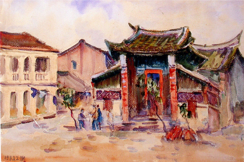 1933年2月的某個清朗冬日,陳植棋的莫逆之交倪蔣懷來到了真人廟前,他使用擅長的水彩,採取與陳植棋相同的角度,描繪真人廟【圖2】。出資成立台灣繪畫研究所的倪蔣懷,雖因種種因素無法走上專業畫家的道路,然而一直默默支持著陳植棋等青年畫家,為台灣美術的發展盡心盡力。他在描繪這件作品時,除了深深思念著年輕早逝的摯友,想必也對台灣畫壇的損失,甚感傷痛。