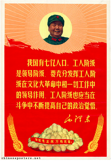 從宣傳海報中,我們也可以看到毛澤東、太陽、工人與芒果的組合。【圖3】畫面可以粗略地分為三個部分,最上方是作為太陽的毛澤東,中間部分的金色文字浮在一片紅旗組成的背景之上,強調「工人階級是領導階級」,最下方的芒果堆明顯取自宣傳隊在清華大學慶祝收到芒果的照片,再次提醒觀者那一關鍵時刻。在此不禁為將芒果帶進中國的巴基斯坦大使掬一把同情淚,在文革的脈絡下,看到芒果,已經沒有人會聯想到巴基斯坦。芒果代表的是毛澤東對工人的支持。帶著經毛澤東「加持」過的芒果,工人取代了紅衛兵,成為文化大革命的主力。