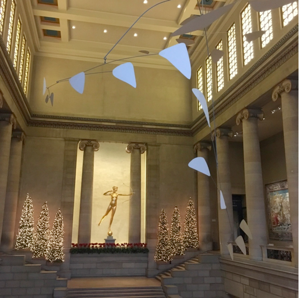 聖古登斯的《黛安娜》直到1925年前都矗立在紐約麥迪遜花園廣場的塔尖,當初只要天氣晴朗,金色雕像便反射豔陽,甚至遠從紐澤西州都能看見,也是首座夜晚能夠特殊照明的雕像,數年前費城美術館進行修復,又將雕像補上金箔,如今在費城美術館大樓梯迎賓的意象格外適切。在同一空間與古典優雅的《黛安娜》對照的是寇德的動態雕塑《鬼魂》,原本為了1964年古根漢美術館的個展而創作。除了傳統與現代、人體再現與有機抽象、靜與動、以及材質的呼應,比較兩者最初的展示場域,還有作品的生命如何在費城美術館延續和重塑意義。除此之外,從二樓往費城市中心(市政廳)眺望,更有另一層詮釋空間。市政廳塔尖矗立賓州創建人威廉賓(William Penn)的雕像,恰好是寇德祖父(Alexander Miline Calder, 1846-1923)的作品,而連結市政廳和美術館的班傑明富蘭克林公園大道中間廣場的噴泉雕像,則是寇德父親(Alexander Stirling Calder, 1870-1945)的作品。因此,《鬼魂》不僅讓三件作品連成一氣,有如三代同堂,亦訴說屬於費城在地雕塑世家的故事。
