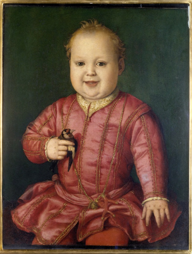 脖子上掛有珊瑚垂飾項鍊的嬰孩。Agnolo Bronzino, Portrait of Giovanni de’ Medici. Tempera on panel. Florence, 1545. Uffizi, Florence.