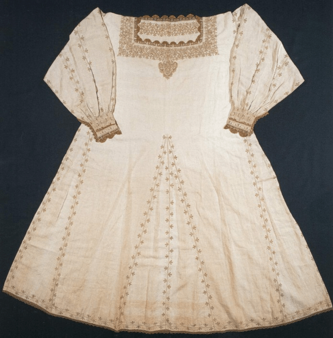 女性亞麻長襯衣。Woman’s shirt. Linen embroidere with silk. Italian, c. 1575-1600. Museo del Tessuto, Prato.