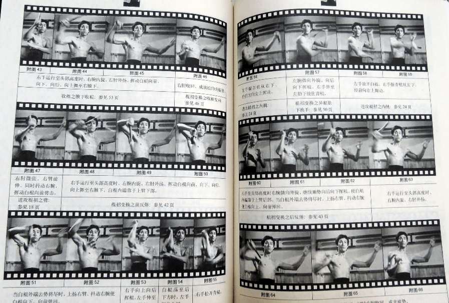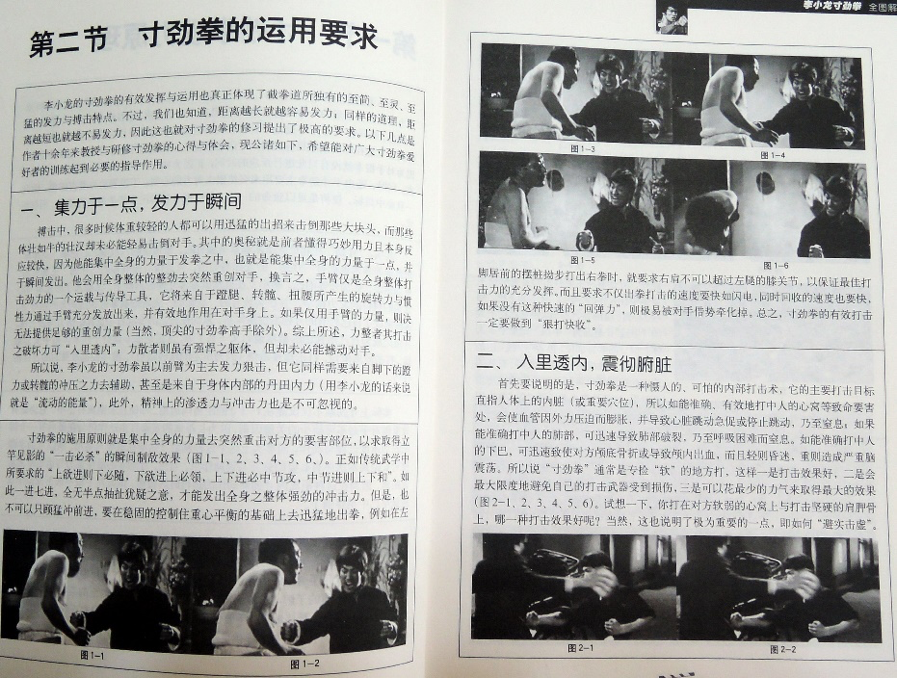 因為太快,所以要慢。因為動態方式無法顯現李小龍的快速擊打動作,所以要用靜態平面的方式,分解其姿態之後,跳躍地擷取影像,正是這種不連貫性暗示著李小龍驚人的速度感。自1970年代起便有大量關於李小龍武術解密與學習的書籍出現,數量之多令人眼花撩亂。其中所使用的圖解自然是平面的,來源也多是電影打鬥情節的片段截圖,使讀者能夠清楚明瞭每一個分解動作,進而模仿與學習【圖12-13】。然而這樣的呈現方式很有可能會解構李小龍的武術神話(可理解、可學習、可複製),這類書籍真能讓學習者成為武術高手的機率想來不太高,就像當年手持雙節棍的影迷們恐怕自傷的程度多一些,也因此,這些書籍圖像其實更像是構成李小龍神話的一部份,因為即便你知道了,也做不到。