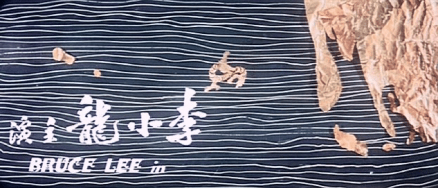 1973年由Robert Clouse(高洛斯)所執導的《龍爭虎鬥》,其電影片頭看起來是走回了老路,但卻巧妙地結合了羅維導演的《唐山大兄》(拼貼剪影)和《精武門》(文字縮放)兩部電影片頭的風格。在畫面構成與動態呈現上又可分為三種類型,其一是片名「龍爭虎鬥」大字橫向疊影(動態)與李小龍劇照剪影(靜態)的拼貼【圖8】,[2] 其二是李小龍劇照鋪底後附上片名擇一之大字組成(皆為靜態)【圖9】,以及第三種以抽象油彩繪圈之底圖(靜態)、李小龍擊打連續動作剪影搭配縮放之大字(此二皆為動態)【圖10-11】。