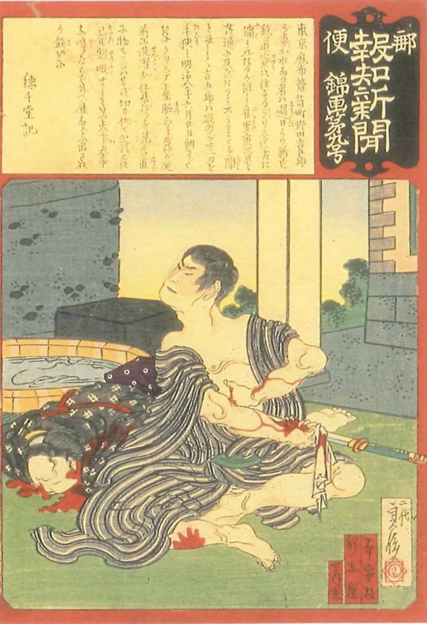 如果說鬼故事還不夠吸人眼球的話,編輯們還有其他絕招讓你想看想買新聞,如刊登在《郵便報知新聞錦畫》的情殺事件【圖2】。圖中男人正忍著身心極大痛苦切腹自殺,因為他懷疑在橫濱與外國人有染的妻子,一怒之下把兩人都殺了再自殺。 有沒有很像我們今天 猩、色、羶的X果日報,原來日本十九世紀中葉下半的新聞編輯們早就意識到什麼內容能刺激銷售量。