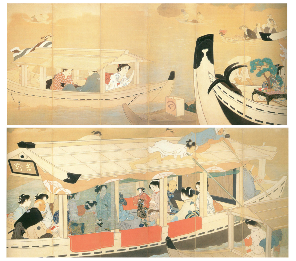 鏑木清方很喜愛川流,因此除了築地川之外,還有以皇居御濠端、隅田川與滝野川為名的畫作。其中,隅田川(舊名:墨田川)是他最常描繪的題材,如《墨田川舟遊》(1914)、《墨田川兩岸》(1917)與《大川之虹》(1952年)等作。他寫道:「《墨田川舟遊》的靈感,是來自我住在濱町河岸時的懷想。打開家中的和式格窗,隨即可見附近流動的大型河川。我擱下筆,走到河岸,筷子還擺在原地。我只有曾經在畫裡,看見泛遊在墨田川的屋形船,許多船隻的流向不一,流動與靜止的川流,皆充滿著想像的誘因。我畫中所繪的船隻,還有大型的屋形船等,每日都川流不息於河道之上。」(大正のあゆみ(二))畫中大小不一的屋形船,乘載著遊人欣賞表演活動,遠處的小船隱沒在雲霧靄靄的邊際,船隻交錯的方向,營造出川流不息、人聲鼎沸、熱絡歡愉的場景。