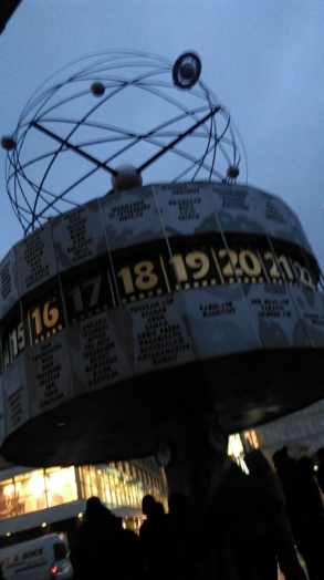 卡爾‧馬克思大道建設完成後,東德政府將東柏林開發重心轉向東柏林的亞歷山大廣場(Alexanderplatz)。亞歷山大廣場位於柏林城中心(Mitte),該區發展時間較早,人口較為密集,地區重要性也高,是19世紀普魯士政權開發重點。東德政府將亞歷山大廣場佈局稍微改良後,設計兩座知名建設:世界鐘(Weltzeituh)【圖4】和柏林電視塔(Fernsehturm)【圖5】。世界鐘和柏林電視塔的外觀都以剛硬的結構組成,用色與許多東德建設類似,採用灰色為主要色調,呈現冷硬形象。當時東德建設世界鐘的用意,在於向世人宣示東德政府擁有精良的工業、科學技術,能夠精準的計算世界各著名城市的時間。而柏林電視塔的建設,也同樣具有宣示意味,從雄偉的設計與高於柏林城內平均建築高度的設計來看,東德政府想向眾人傳達:東德政府有能力建造出大型公共建設;東柏林城市發展較西柏林為佳,城市地位也較西柏林高。