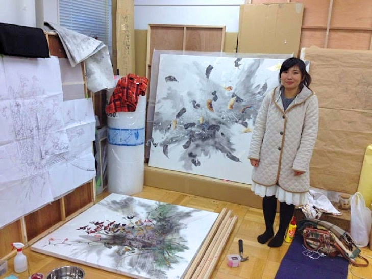 留日初期,她與當代日本畫的創作者、研究室的同儕,同樣著迷於膠彩的礦物質感與箔的金屬感,並追求學習如何控制顏料與膠的比例,才能讓厚重的顏料附著在畫板上。不過,當代「日本畫」的厚塗風潮,不禁讓她思考這樣的日本畫是否越來越趨近「油畫」?之後她重新回歸原點,回到她「水墨畫」的專業背景,讓當代日本畫中僅作為打底的墨線、墨色,晉身為主角,大膽潑灑在日本畫紙上。