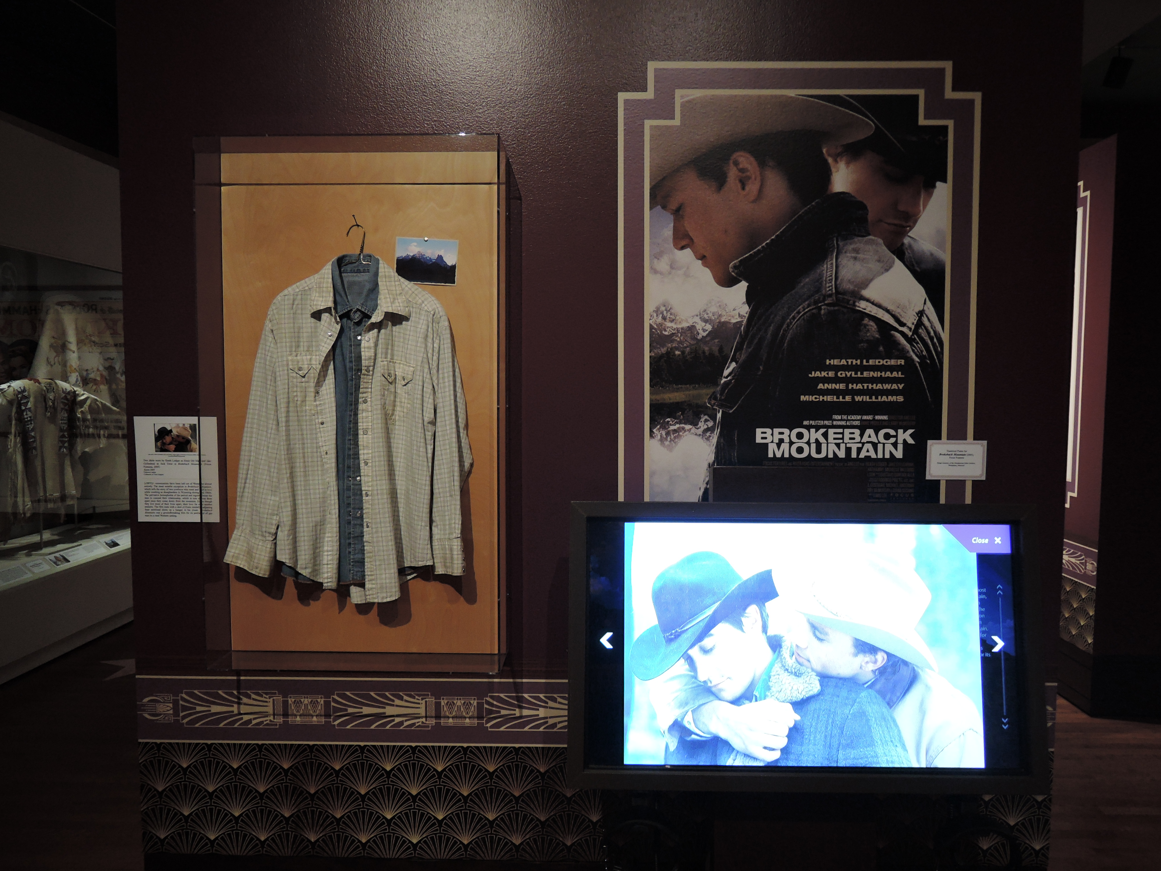 展場的另一亮點是李安執導《斷背山》電影(Brokeback Mountain, 2005)中傑克(Jack Twist)的戲服,搭配著電影的劇照與海報,讓人回想起電影的情境,特別是最後一幕。在拖車屋中艾尼斯(Ennis Del Mar)打開衣櫃,櫃門上他與傑克的襯衫套疊在一起,象徵兩人深深擁抱永不分離的鏡頭,也省思西部片的演變與現今角色的性別設定。【圖4】同性戀族群長年以來被西部片類型忽略,《斷背山》實屬特例,顛覆了傳統男性氣概主導的類型傳統,將同性戀的角色元素與雄渾的西部風情並置。描述60年代兩名牛仔在懷俄明州放牧所培養出的同性情誼,提供對傳統西部片的新詮釋。展間除了平面電視外亦搭配諸多圖卡,解釋西部片中不同族裔、性別等角色問題。