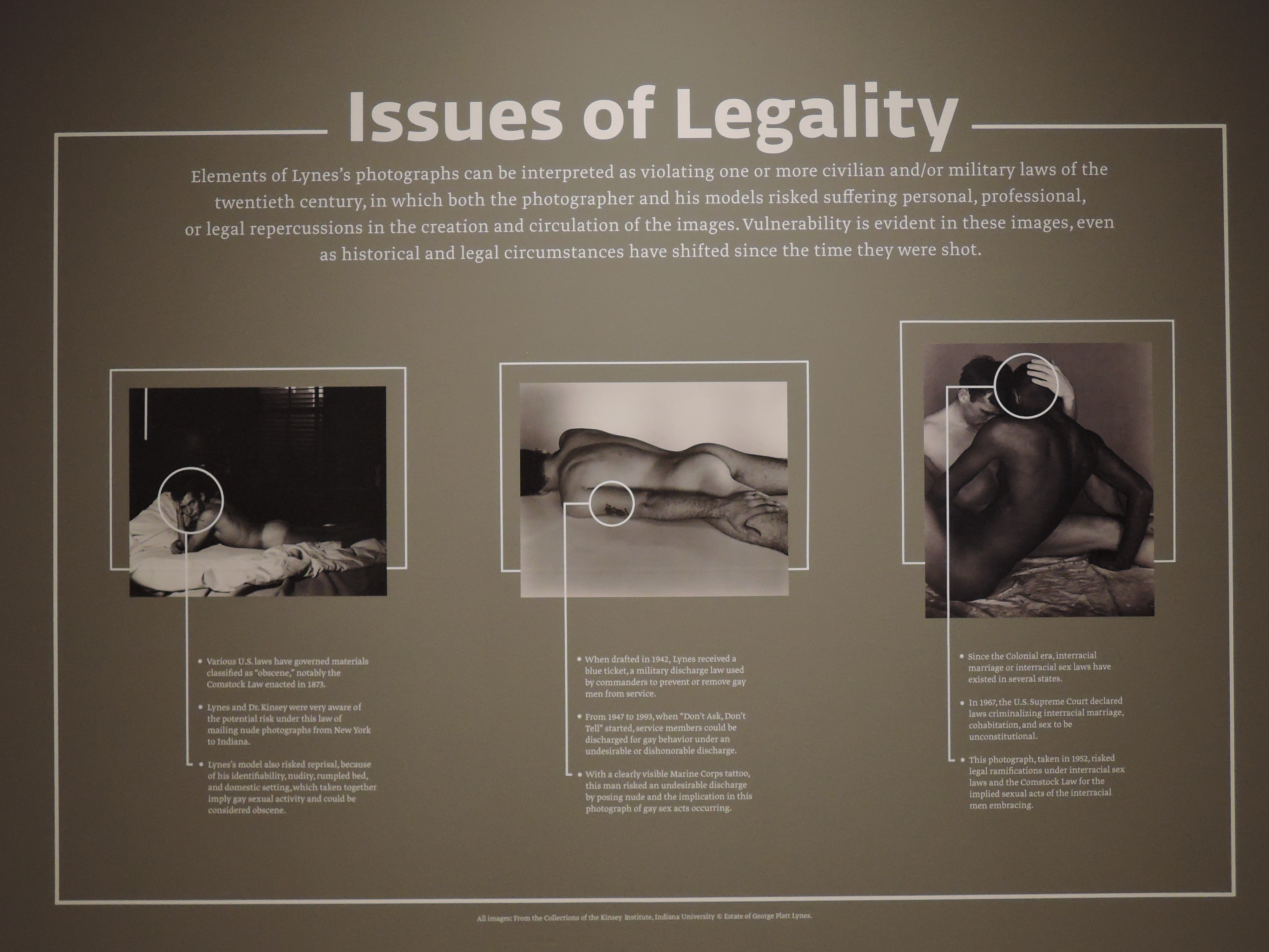 萊恩斯男性裸體肖像的爭議性不僅來自美國社會當時保守的道德規範,更牽涉到法令的問題。關於這點,策展團隊特別安排圖說,因為美國法令有明文規範或定義何為「猥褻」,【圖5】而金賽博士和萊恩斯在印第安納州與紐約市兩地的書信往返和男性裸體照的寄送,皆很有可能會觸犯相關法令。另外,萊恩斯的男性模特兒也冒著極大的風險,因為一但相片公開展示,模特兒被指認出來,這些隱含男同性戀的擺拍姿勢、場景都可能被冠上「猥褻」的罪名。【圖5左】事實上,當萊恩斯在1942年被美國軍方徵召時,他就直接收到美軍為排除男同性戀服役的退伍令。美國軍方從1947到1993年對於同性戀採取「不問、不說」的政策,只要服役士官兵牽連到與同性戀相關的行為都有可能被迫退役,喪失軍餉退俸。當男模特兒身上的海軍陸戰隊刺青呈現在相片中時,也意味了其軍人身份可能被和同性戀劃上等號,因而受罰。【圖5中】