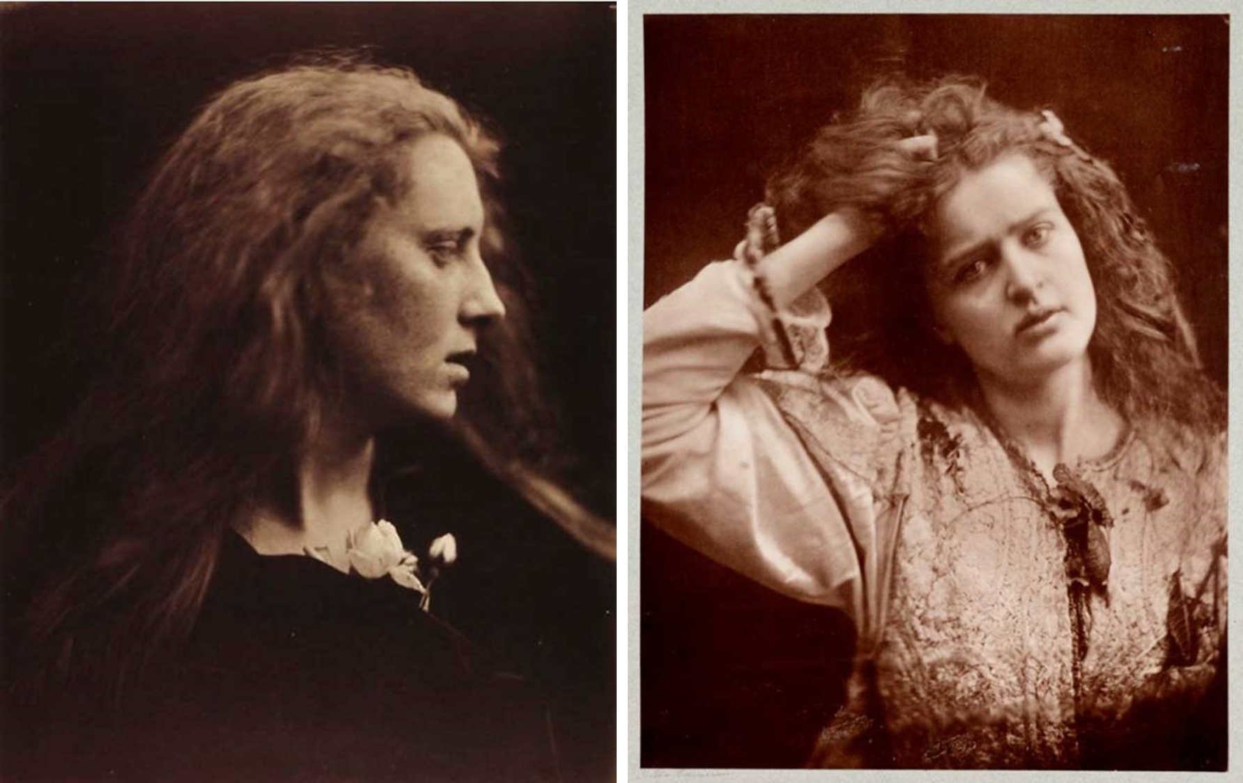 除了畫作,歐菲莉亞的主題也被廣泛呈現於攝影中。知名攝影家朱麗亞·瑪格麗特·卡梅隆(Julia Margret Cameron, 1815-1879)便曾以此創作多幅作品。【圖2】【圖3】在這些照片中,卡梅隆以近距離的取景呈現大幅的肖像形式,使得模特兒的情感表現深具感染性,而她喜用的柔焦技法,也為這些作品增添神秘幽微的氛圍。卡梅隆鏡頭下的歐菲莉亞有時穿戴深色、斗篷狀的上衣,似與幽黯背景融為一體,有時則穿著素雅細緻的淡色服飾,暗示著她身為青春女性的身份。但無論如何,歐菲莉亞的長髮總是紊亂披垂,與一般淑女的潔整髮型相去甚遠,有時在髮際、帽簷、衣服上更帶有花葉殘枝。此外,卡梅隆常將模特兒匿名,讓她們從真實身份抽離,成為純粹的文學角色,但又常在照片後面寫下「寫生」(from life)。似乎刻意透過攝影特有的指涉性,將精神不穩的狀態與普遍的女性形象相互連結。