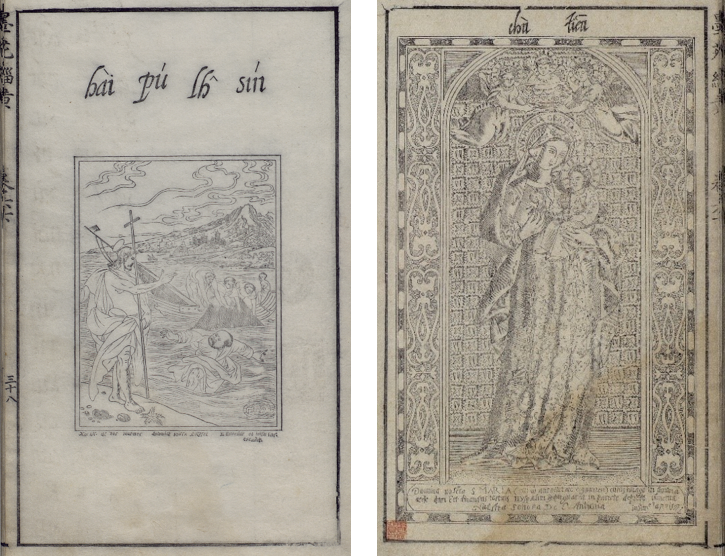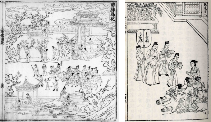 徽州地區,不只是上面所提過的方于魯,另外還有製墨商人程君房(1541-1610之後),他刊印了《程氏墨苑》,把墨上裝飾紋樣的稿本,收集起來印製成書。這本《程氏墨苑》有五百多種紋樣,當中甚至收有來自日本和西方的銅版畫【圖6】、【圖7】。程君房和方于魯有著很複雜的恩怨情仇,為了要勝過出書在前的方于魯,程君房兼容並蓄地收錄眾多的紋樣,早年的版本還有一版多色的印刷【圖8】,印刷的紋樣也相當的精美細緻。雖然是以仇恨出發,卻開出了美麗的果實。總之,晚明時期的版畫發展到了一個高峰,當中還混有不少的外來文化。而且,書籍上的插畫,比起傳統的繪畫,更能接受外來的新風潮。