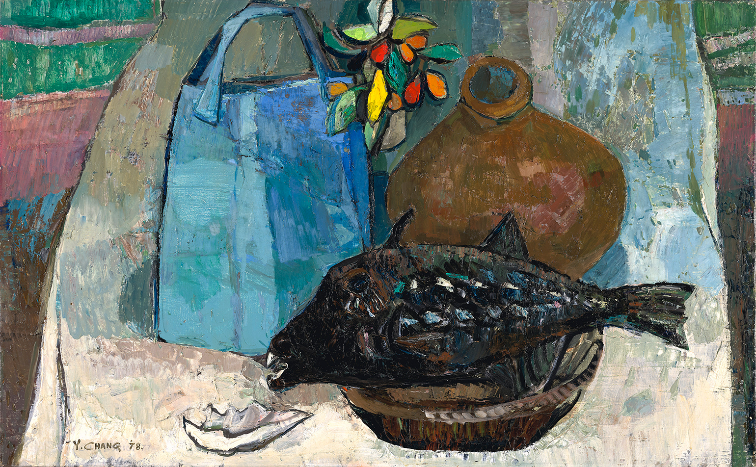 張義雄的《蘭嶼紀念》又如何處理這個主題?在這個系列作品當中,可以明顯看到來自於傳統文化的事物:魚、陶甕、陶碗、土偶、貝殼、紅黃相間的植物果實。然而當我們藉由這些事物進入了達悟族的文化脈絡,所謂的「傳統」便成為「日常」:有捕魚的季節,也有製作陶器的季節;有給女人吃的魚,也有給男人吃的魚。植物的果實提供了食物,[3]木材成為造屋與造船的材料,家家戶戶必備的貝灰(Mabcik)則以畫中的五爪貝來製作。在海洋所孕育的思維下,一切均緊密又和諧地互相關聯。