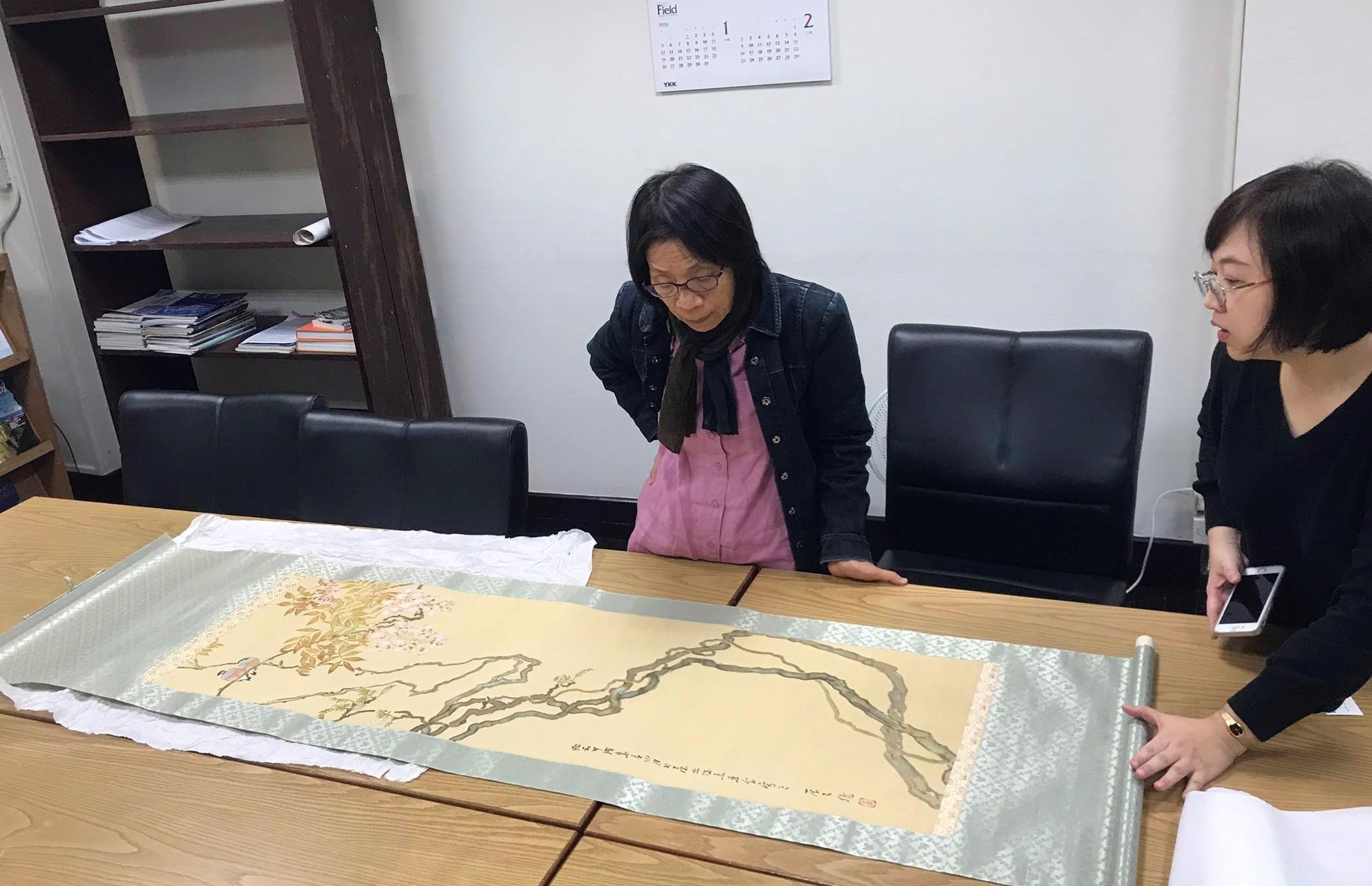 郭江宋老師(左一)向團隊與公視《藝術很有事》製作人徐蘊康女士(右一)說明鹽月桃甫作品修復。楊淳嫻攝於2019年11月7日。
