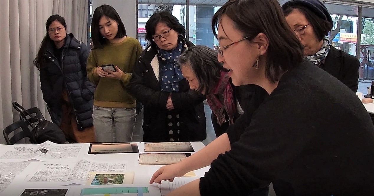 與北師美術館展覽統籌王若璇女士(右二)討論文獻展示規劃。蔡家丘攝於2020年2月19日。