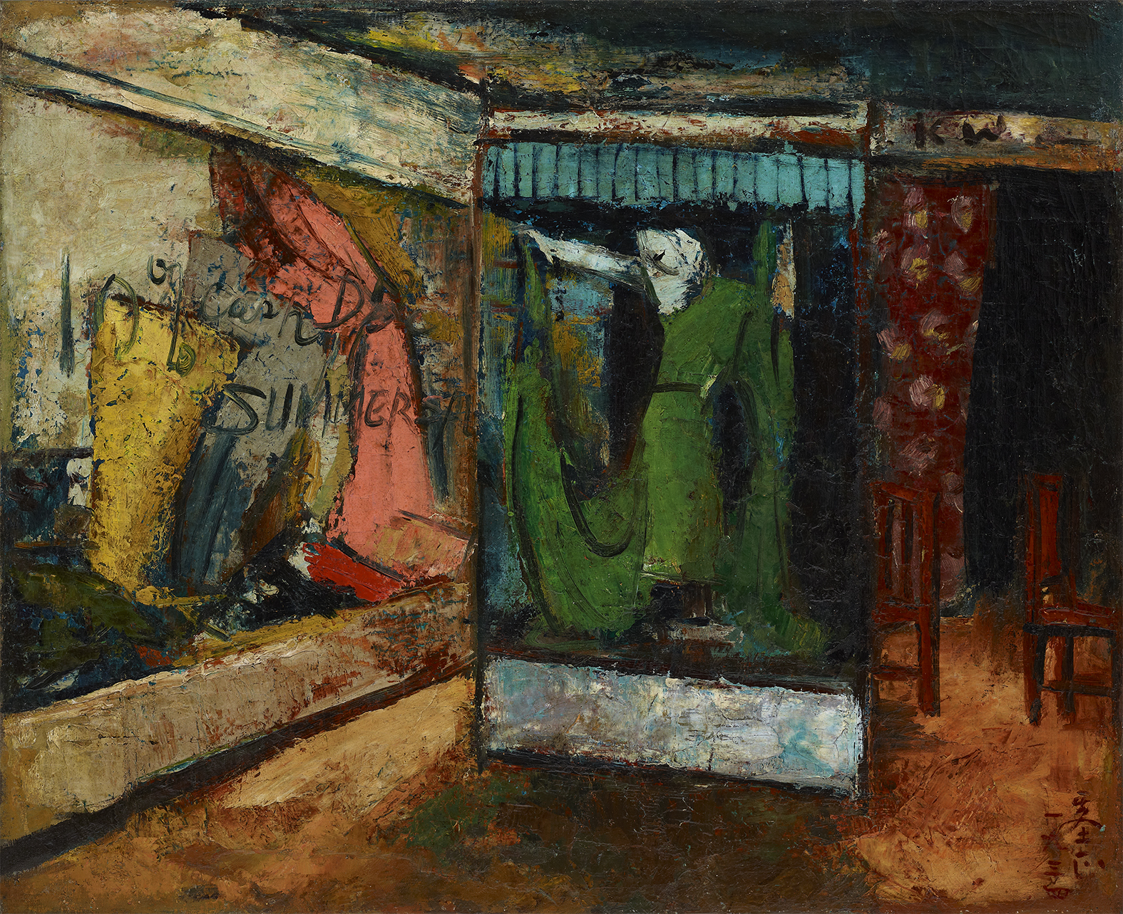 1934年,王逸雲建議呂基正參加台灣美術展覽會,最終以《商品櫥窗》【圖3】入選。這件作品以大膽的筆觸與強烈的色彩,描繪神戶元町商店街摩登與日常的一面,畫風可見到今井朝路和林重義的影響。此外,黑色線條與在畫面中書寫文字的作法,也令人聯想起佐伯祐三(1898-1928)所描繪的巴黎街景。
