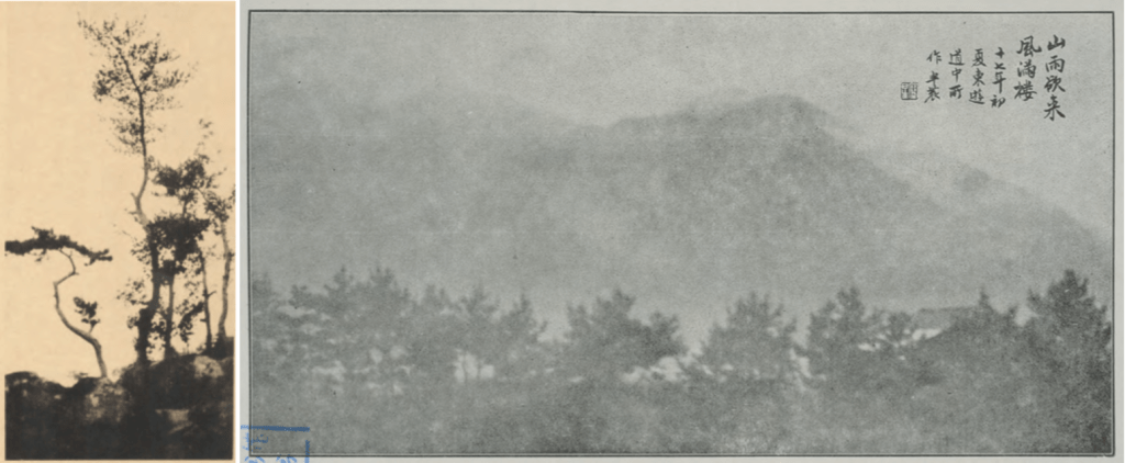 收錄其中的攝影作品也印證自序所言,題材主要為風景或花草樹木,追求古典詩詞與繪畫的意境【圖5】。其他光社成員的作品中也可看見充滿中國藝術色彩的攝影作品【圖6】,甚至模仿捲軸的形式。然而北伐戰爭的初步成功,國民政府於1927年定都南京,光社成員隨之南下,社團逐漸失去活力,美術攝影的重心也轉往上海。