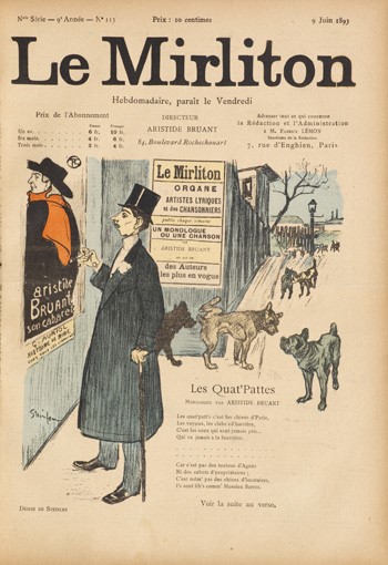 在《Les Quat Pattes》【圖3】中,亨利・德・土魯斯-羅特列克(Henri de Toulouse-Lautrec,1864-1901)畫出當時紅極一時的歌舞劇演員阿里斯蒂德·布魯安特(Aristide Bruant)標誌性的黑色外套、 帽子和亮紅色的圍巾。布魯安特對此人像畫很滿意,在他歌舞表演所展示的海報中,也出現這件人像作品,這張海報的圖像便說明了蒙馬特街頭隨處可見海報張貼的生活情況。