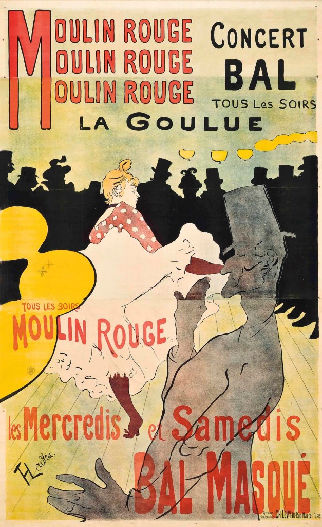 《Moulin Rouge:La Goulue》【圖5】為亨利・德・土魯斯-羅特列克描繪的1891年夜總會場景,蹬高腳的舞者La Goulue外露的褲襪標誌著她獨樹一格的舞蹈特色,又同時呈現粗俗的樣貌。此張海報設計中輪廓分明的人群、醒目的紅色字體以及黃色對話框,形成了獨立的圖案結構;當時打印了三千張海報,張貼至整個巴黎,震撼人們的雙眼,並成功吸引人們注意紅磨坊表演的活動內容。