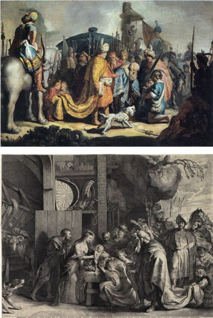 現藏於巴賽爾藝術館,林布蘭青年時期的《大衛向掃羅呈上哥利亞首級》(David with the Head of Goliath before Saul, 1627),參考了魯本斯《三賢士來朝》(The Adoration of the Magi),後由佛斯特曼製作摹本的版畫作品(Lucas Vorsterman after Peter Paul Rubens, 1621)。兩畫相比,可見畫中主體人物之一穿戴頭巾、披風,跪姿和披風皺褶的近似。林布蘭此畫經過X光檢驗後,發現底層還藏著一幅肖像畫,依稀可見戴著東方頭巾的一張臉孔,推測可能是一幅“Tronie”(原意為荷蘭語「臉孔」之意),這是一種畫家練筆所作的無名肖像畫,畫中人身份通常不可考,有時穿戴特殊服飾或手持道具,供畫家練習描繪臉孔或姿態。如果這幅Tronie後來沒有被覆蓋新畫,極可能就是林布蘭最早一幅東方肖像畫。