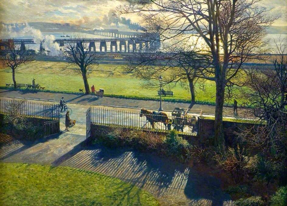 蘇格蘭畫家派崔克(James McIntosh Patrick, 1907-1998)在二戰時、將赴前線之際,完成了一張動人的作品【圖1】。《一座城市裡的花園》俯視了他家的後院。在這深秋時分,幾乎所有樹木上的葉子都掉了下來,只剩下幾顆未摘的蘋果,高掛枝頭。分歧混亂的樹影底下,畫家的妻子正晾著衣服,女兒則在一旁玩耍。畫家看著再平凡不過的自家後院,心中卻蒙上一層訣別的陰影。戰爭讓人們對未來充滿了不確定感,也讓家園顯得格外親切而易逝。數年後,迎來戰爭的結束,派崔克這次以自家前院風光為背景【圖2】,畫出了一幅與圖1在空間上前後呼應的作品。[1] 站在門口的妻子,她迎面的馬車,彷彿就載著先生卸甲歸鄉的行李,給人無限的想像。若以此車道作為中景(middle ground),畫中的遠景(back ground)是跨越河面的火車和一整片的公用綠地。前景(foreground)則是由鐵欄杆區隔出來的自家前庭。若說這三層空間由遠到近,逐步反映了公領域到私領域的敘事轉折,那麼這私領域的最深處,應該要串聯扣回到圖1才是。意即,有了醞釀離別的後院【圖1】,才有展現重逢之喜的前庭【圖2】,而貫串兩者的,不僅是戰事,更是與戰事奮力抗衡的家園。