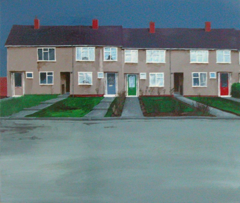 最後一位要談的畫家是邵歐(George Shaw, 1966-)。二戰後,英國蓋了百萬戶住宅,促進人民安居。這些住宅有各種型態,包含連棟(terraced)或雙併(semi-detached)的房屋(house),約二到四層樓高不等。若全棟坪數較小,可能供一戶人家居住。若是更大些,則可每層作為公寓(flat)使用。除了這種集合式住宅外,獨棟的建物則有一層樓高的長方形平頂小屋(bungalow)或兩層樓高的尖頂小屋(cottage)。當然,類似我國國宅型態的電梯大樓,也十分常見。以上皆可由開發商(developer)或地方政府(council)出資興建,前者自由買賣,後者為公用住宅,只租不賣,稱為council estate。邵歐就是在英國中部城市考文垂(Coventry)外圍、瓦片丘(Tile Hill)一帶的council estate裡長大。從30歲起,邵歐才開始了他council estate的系列繪畫,再現了這形塑他和許多人童年回憶的場域。[2] 圖4描繪門牌號碼57號的老家(綠色門者),平穩塗敷的顏料讓畫面顯得一絲不苟,而無人的場景讓這份一絲不苟顯得焦慮緊繃,無處可躲。這種熟悉卻不熱切的奇妙感覺(筆者表示:難道這就是英國給人的感覺?),成為邵歐風景畫的特色,展露於瓦片丘附近的無人樹林、遼闊足球場和空地車庫等生活場景之中。