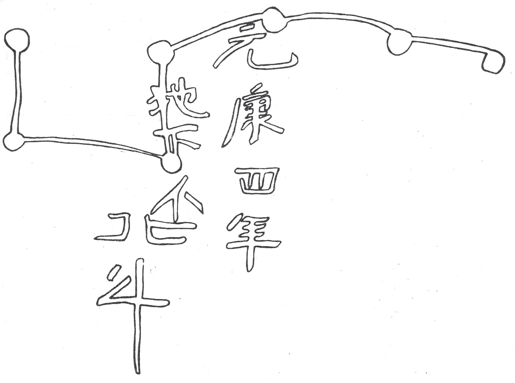 陝西西安東郊田王西晉元康四年(294)墓編號M462,由墓道、甬道、前室、過洞、耳室、後室所構成。墓門朝北,前後室均作穹隆頂。前室東耳室中有一人骨架,後室並列兩具人骨架。在前室頂部北壁與甬道口上部牆壁0.7公尺的範圍內,畫有北斗七星母題,並書有「元康四年地下□北斗」【圖1】。榜題與北斗七星相重疊,北斗二字的比例較大。在西壁南端畫有圓,並書「月」字。西壁有月,因此東壁很可能原來畫有日象。魏晉時期中原地區流行薄葬,墓葬中罕見任何圖像,元康四年西晉墓中出現北斗母題,顯得頗為特殊。這也是魏晉時期墓葬中,唯一在墓室畫出北斗七星的例子。