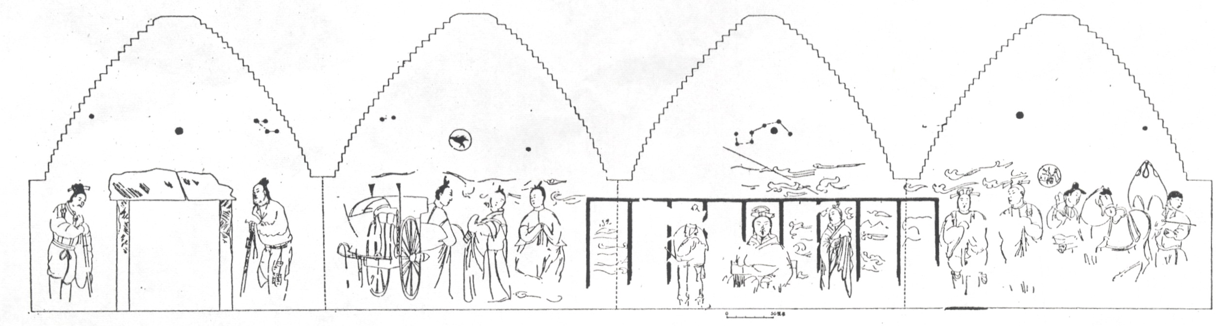 北朝墓葬中的北斗七星可見於北魏孝昌二年(526)元乂墓與北齊天統五年(569)□道貴墓壁畫。不過元乂墓中的北斗僅為星圖的一部份,並非天文圖的中心,在繁多的星宿中其形象並未特別突出。北齊□道貴墓中的北斗七星則較為顯著。□道貴墓位於山東濟南市馬家莊,墓葬形制為單室墓,墓向南略偏西。穹窿頂四方各繪一大星,北方為北斗七星【圖3】。西方繪有日,東方則繪有月,日月的方位與一般的墓葬相反。其中北斗七星位在北側,其位置並非位在墓頂,而是與日月居於同一高度。墓室北壁為墓主畫像,墓主瞑目,兩袖搭於几案上。北斗位在墓主畫像的正上方。若考慮北斗與墓主畫像的關係,則北斗除了作為天界的星宿之外,可能還兼具鎮護墓主的作用,具有類似七星板的功能。