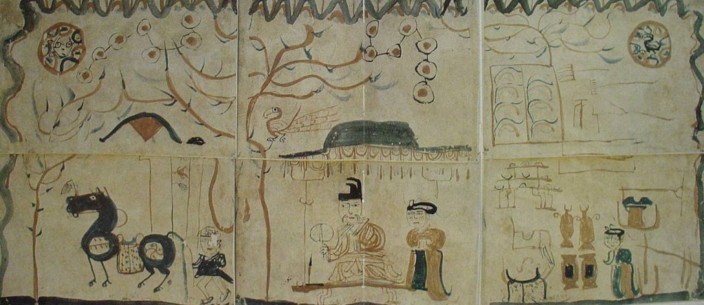 這種北斗與墓主畫像的親近關係,也可見於吐魯番阿斯塔那古墓。吐魯番阿斯塔那魏晉時期墓葬中所出土紙畫「墓主生活圖」【圖4】。圖中日、月與二座北斗貼近紙幅上緣,其中一座位在墓主畫象的上方。另有同為吐魯番阿斯塔那古墓出土的「莊園生活圖」壁畫,位在墓室北壁,長約2公尺、寬0.68公尺【圖5】。畫面右側為莊園田地,中央為墓主夫婦畫像,左側為庖廚與騎馬人物等。中央帷帳內坐有三人,前方有一長方形几案,右側有牛車與馬。牛車旁有「車牛」榜題。帷帳左右上角各有一頭形,畫有五官與鬚,並分別書有「月像」與「日像」。墓主夫婦畫像中有三人,左側一人較高,應該是男性墓主。墓主與帷帳之間繪有北斗七星與星宿,榜題分別是「北斗」與「三台」。將北斗繪於帷帳內,貼近墓主畫像位置,刻意將北斗與墓主併置,藉由縮短空間上的距離來建立兩者之間的密切關聯。