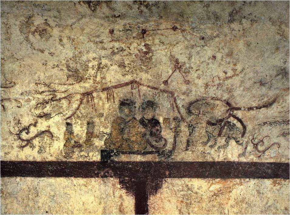 高句麗壁畫墓可見到類似的表現。平安南道南浦市藥水里壁畫古墳年代約在四世紀末五世紀初,由甬道、前室、後室所組成。後室上半描繪日月、四神、星宿等天界圖像。墓主夫婦坐於榻上,上方有帷帳。值得注意的是墓主畫像位在後室北壁上側,與天界圖像的高度相同,並且位在北斗七星的下方。如果說吐魯番阿斯塔「莊園生活圖」壁畫中的作法是將北斗移至墓主帳內;在藥水里古墳中則是將墓主提升至天界,並且以北斗來護佑墓主【圖6】。兩例中北斗與墓主的主客關係不同,但是都表達了墓主為北斗永恆相伴的願望。