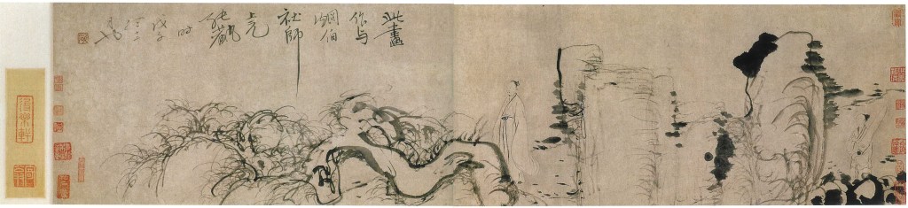 饒宗頤(1917–2018)在1976年對張風的研究中,認為這件讓張大千以「大風」為室名的作品,就是現藏於香港藝術館虛白齋的《炯伯社師圖卷》,卷前還留有張大千題寫的「大風墨戲神品」引首【圖1】。[2]張風現於普羅大眾間的知名度或許不如張大千,但從《炯伯社師圖卷》【圖2】中確實可以看出張風作品的非凡魅力,讓張大千在購藏畫作後,熱切地向當時著名的書畫鑑賞家,例如黃賓虹(1865–1955)、吳湖帆(1894–1968)等人展示作品,並將求得的多則題跋裝裱在卷末。[3]