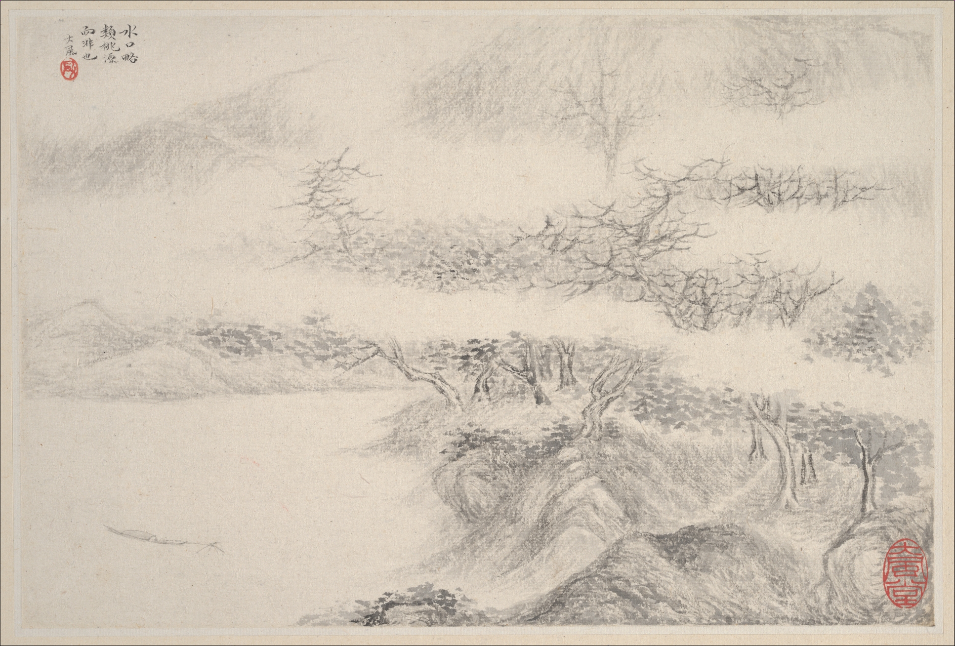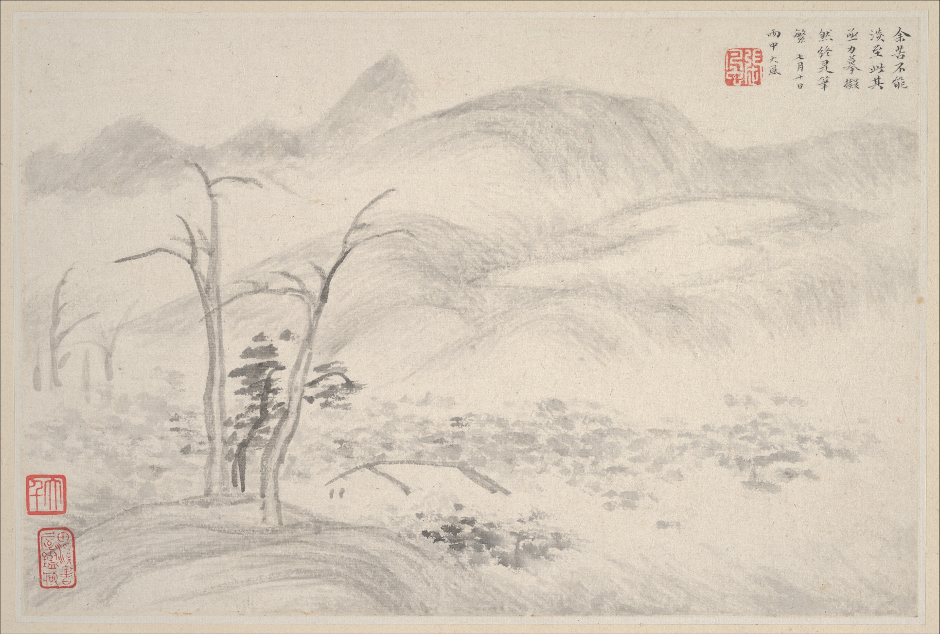 張風至今也留存有細密一路畫風的作品。現藏大都會博物館的《山水圖十二開冊》,也曾經為張大千收藏過。[6]冊中所畫物像輪廓鮮明,體量結實,構圖規整,常見層層添加的淡墨渴筆,間或施以淡雅清潤的色彩。題有「仿倪」一頁【圖4】,圖中的枯木、石面上的折帶皴確實源於倪瓚(1301–1374)。而題有「余苦不能淡至此,其亟力摹擬,然終是筆繁。七月十日雨中。大風。」一頁【圖5】,可以感受到張風極力擺脫繁複謹慎的畫法,嘗試以看似無技巧的簡化線條表現前景樹木與房舍,但此時仍未能完全不受慣常畫法的制約。綜上所述,可見張風稍晚不拘泥於既有筆法的獨特畫風,是張風在學習了古代大家的畫法後,逐漸擺脫前人技法束縛的結果。