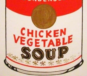 此外,為了使作品《康寶湯罐》【圖2】罐頭上的標籤能更具有印刷效果,沃荷在此時併用鏤刻版(stencil)的方式創作,首先,他將「Campbells」這幾個英文字以外的部份鏤空,文字與紅色背景的邊界也會較銳利、清晰,這樣便能快速的複印標籤文字。鏤刻版印出來的圖案效果與廣告印刷相當接近,這也有助於沃荷達到他圖像反覆的形式表現。這是沃荷在風格表現上的關鍵性的轉變,他以精確的平塗達到機械複製的效果,完全硬邊的著色表現及拷貝廣告中的圖像顯現了沃荷挑戰抽象表現藝術的決心。