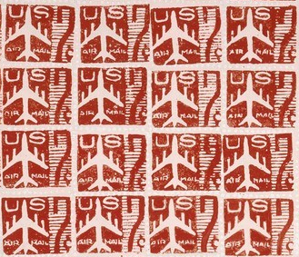 當然,仔細看《康寶湯罐》,除了「Campbells」這幾個英文字外,最底層的圖案是以蓋印(stamp)的技法呈現【圖3】。使用蓋印這技法就像是蓋章一樣,沃荷以橡皮擦為製版材料並徒手刻製,一但刻好圖形後,就能快速的印出許多圖案。1962年,沃荷以「郵票」為創作題材的時候,他所使用的就是以這種橡膠板徒手刻製,作品《紅色的郵票》(Red Airmail Stamps)【圖4】是他在橡皮擦上刻製一張比原吋還大的郵票,再印出一排排的圖像,因為是手工製版,所以圖像邊緣較不整齊,而圖案上的文字看起來也有些不規則。