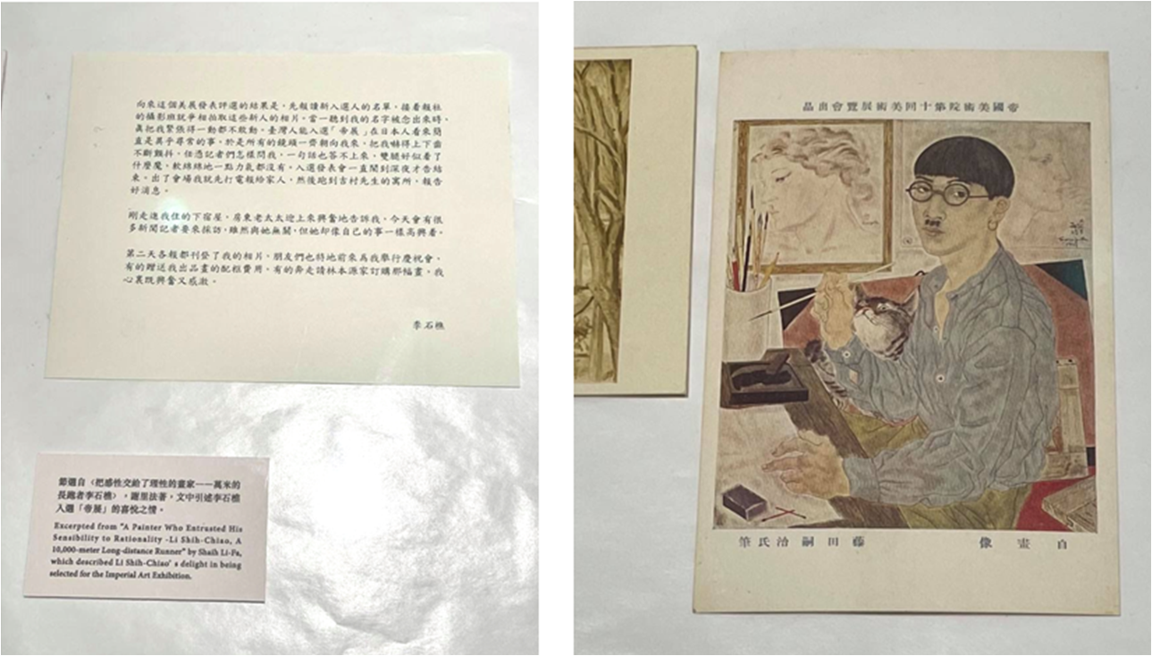 以藝術藏品的第一個展間「蓊鬱──百歲前輩典範」為例,我們在當中放置了官辦美展的相關文獻。在那個年代的藝術家,最早期的時候只能夠通過官辦美展獲得認可及大眾的認識,雖然一般人想到的是臺展、府展與省展,但我這次特別把帝展納入,最主要是因為這些前輩藝術家大多前往東京留學,帝展對他們而言又是最高的榮譽級別。其中有一段文字,是李石樵(1908-1995)講述他在帝展上獲得名譽時的反應,這能直接讓現代人去理解得到帝展的認可在當時是一個多大的榮耀。我們刻意提供了藤田嗣治(1886-1968)的作品明信片作為引介,讓對帝展陌生的現代人,能夠透過這位世界出名的藝術家其曾經入選帝展的歷史,了解李石樵、陳植棋(1906-1931)等人也曾與他肩並肩過。