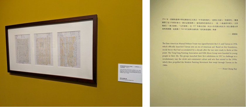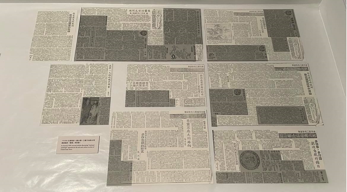 此展區中,能逐漸看到大陸來臺藝術家的水墨作品。文獻便展示當時的正統國畫之爭,其中謝里法捐贈的《新藝術》雜誌,是臺灣第一本藝術專屬雜誌,由大陸來臺藝術家何鐵華創辦,內容能看到兩派人馬各說各話的樣貌(笑),再現了當時文化之爭,其實就是現今的「筆戰」概念,這個爭論延續了36年;另外,我在查資料時發現有趣的地方,像是《聯合報》也曾做為這場對話的戰場,我們看到這場文化之爭發生在當時大眾的視野。