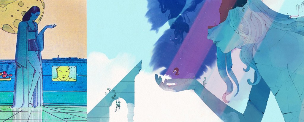 遊戲中大量的手繪場景,讓玩家感受到了創作者的溫度,細緻的線條與水彩,讓每一個場景都彌足珍貴,這或許得歸功於康拉德‧羅賽特。這是康拉德第一款參與製作的遊戲,在此之前他早已是西班牙獨具風格的知名插畫藝術家。不過在《Gris》之中,他和團隊們所營造出的水彩世界,不只結合了他的藝術風格,也看得見許多前輩藝術家的影子。其中《Gris》的許多場景,不免讓人聯想到了歐洲漫畫大師墨必斯(Moebius,本名:Jean Giraud)的風格。身為科幻漫畫家的墨必斯,其影響無遠弗屆,也參與許多好萊塢科幻電影的製作,甚至是手塚治虫、大友克洋、宮崎駿等日本動畫導演也深受他的啟發。如今我們也能在電子遊戲中發現他的蹤跡,《Gris》正是一個很好的例子。
