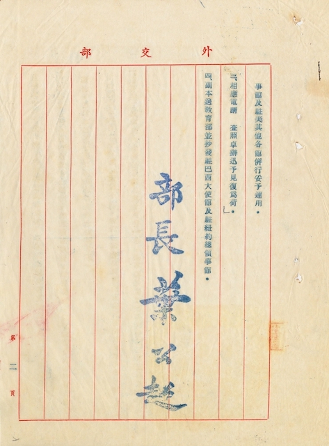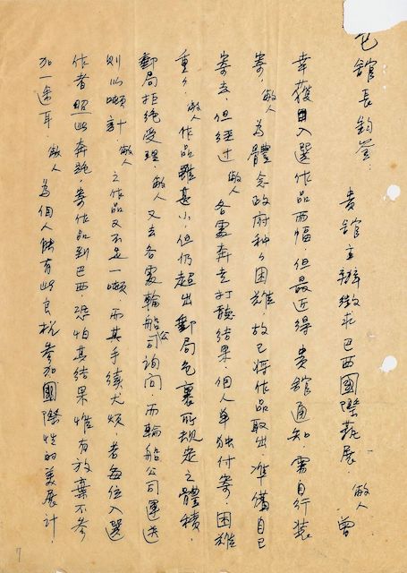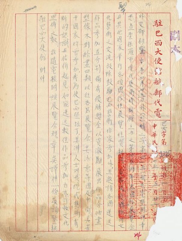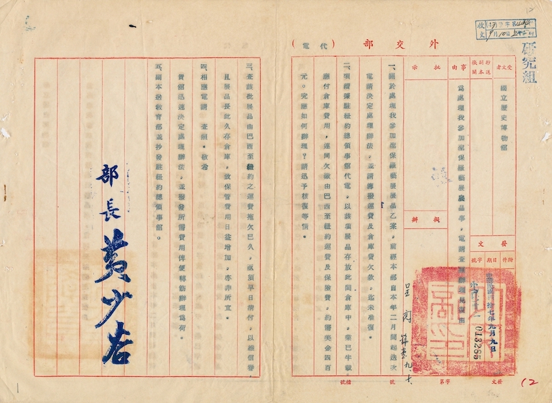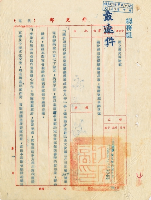 駐巴西大使館在1956年收到來自聖保羅現代美術館(也就是聖保羅雙年展主辦單位)邀請我國參加1957年舉辦的第四屆展覽,於是發電報給外交部,認為聖保羅雙年展「旨在促進國際間文化藝術之交流……如能選送較佳作品參加,自亦可收文化宣傳之效」(045-100013-1-024-0001),【圖1】之後在1957年4月確定由教育部轄下的國立歷史文物美術館(後於1957年10月正式定名為國立歷史博物館)主辦。這個年份有一個值得注意之處。國立歷史文物美術館於1956年1月成立籌備處,由包遵彭任籌備處主任,1956年3月正式開幕。一個還處於草創期的機構,便要承辦繁複的國際展覽事務,其中的艱辛是可以想見的,而經費是最直接遇到的問題。