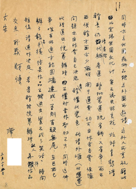 一份關於運送的有趣文件值得一提。初次參加聖保羅雙年展,史博館原先希望由參展藝術家自行運送作品至展場,因爲依據過往經驗,運送作品過程往往多所曲折。然而徵詢參展藝術家們的意願,多數仍希望史博館代為運送,例如席德進便去信史博館館長包遵彭,建議由史博館代辦寄運,因為:「輪船公司運送則以噸計,敝人之作品又不足一噸,而其手續尤煩。若每位入選作者照此奔跑,寄作品到巴西,恐怕其結果惟有放棄不參加一途耳。……統籌辦理,不僅對者作[作者]幫助不少,同時這件事唯有此途方能圓滿達成,否則有頭無尾,在巴西已辦了報名手續,結果作品不能送去,豈不成了笑話?時間短促,請速作決定,若貴館能統籌辦理,敝人再將作品交來。」(045-100013-1-013-0007~0008)【圖6、7】