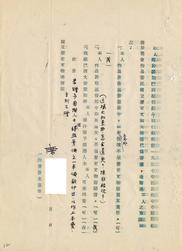 也就是說,作品在運送過程中有任何損壞或遺失,博物館這邊概不負責啦。多數的藝術家都隨和地表示同意,但快人快語的席德進則在同意書上加了眉批。關於作品遺失的條文,他註記:
