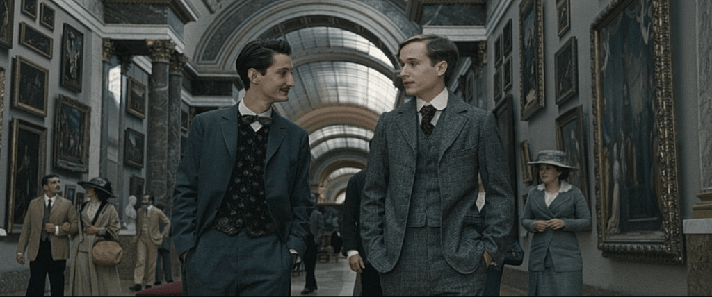 再看2016年上映的《雙面法蘭茲》(避免劇透,在此對劇情有所保留)中兩處觀展場面,也頗值得玩味。電影開場十五分鐘左右,藉以男主角阿德里安的敘述,導演歐容將其在戰前與弗蘭茲共遊羅浮宮的回憶以彩色畫面鋪展(而本片絕大部分為黑白)——兩人愉快地徜徉在掛滿畫作、觀眾如織的羅浮宮內,一派歡樂祥和的景象。館內僅管滿是藝術瑰寶,卻並不顯得高高在上。對藝術陳列空間的如此再現,更是對「一戰」前和平美好的巴黎生活與兩個青年人友誼的象徵(隨著故事的推進,我們會發現這種美好或許僅存在於一廂情願的想像中)。