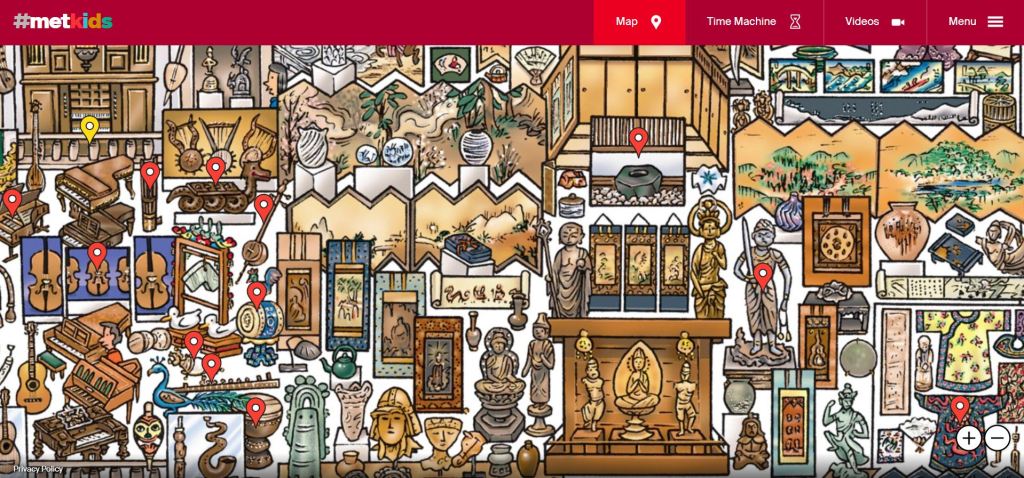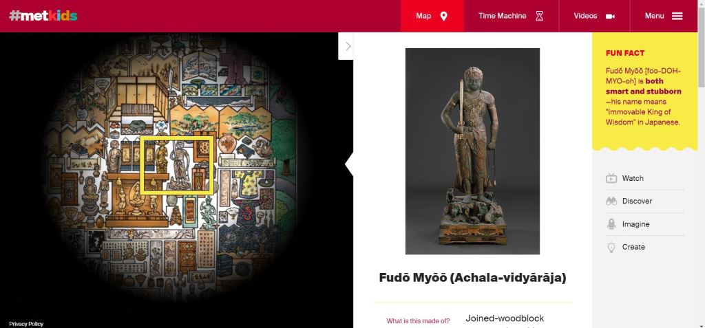 對於小孩子來說,又會怎樣「欣賞」佛教藝術呢?這尊不動明王像,可說是大都會博物館「主打」的作品之一,在為小朋友設計的網頁 #metkids 中也出現了。用explore the map(搜尋地圖),可以找到富有童趣的簡圖。這個好大的圖中,某些標有點點的作品,可進一步點選,看到原作照片及其他介紹資料。由此點選watch,則可看到一段小朋友自己製作的短片,由這尊不動明王像啟發(#MetKids—Animation Inspired by Guardians and a Japanese Protector)。