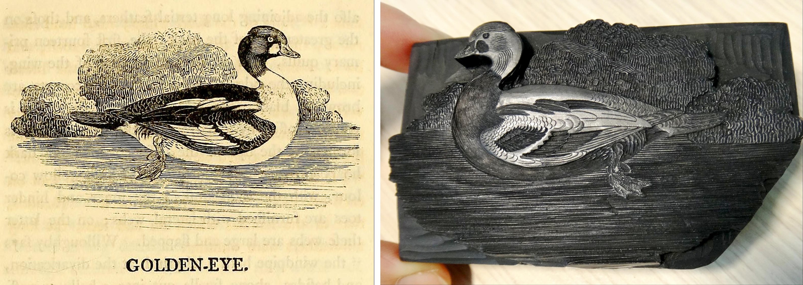 說到畫面的濃淡效果,手繪畫面也許很容易製造,但以線條為主的印刷版畫(尤其是木版畫)卻很困難,畢維克有另一種獨到的手法來表現,就是把一個平整的木板表面,雕成凹凸起伏的地景,[2] 近景的焦點動物是最凸出的部份,遠處的背景依次往下陷,如此在上墨印製時,凸起的部份受墨最多,但雕刻時刀工最少,刻工必須以反向思考,越需要留白的地方越需要下刀。不只是背景如此,連動物身體也有深淺度的區別,以筆者在新堡市立圖書館拍攝的館藏畢維克「鵲鴨」(Golden-eye)木雕版【圖13】來觀察,不難看出這隻水鳥的身體不只是黑白兩色的差別而已,白色下腹在木板上是下陷部份,但仍有頭深尾淺的不同深度,紙本【圖12】上呈現的則是頭淺尾深的灰色;而上面的黑色背部,雕版邊緣呈弧形往下緩降,印出來的效果便是邊緣漸淡的立體感,在在可見藝術家並非以平面來思考黑白版畫,而是以立體雕刻和濃淡繪畫的概念來創作。