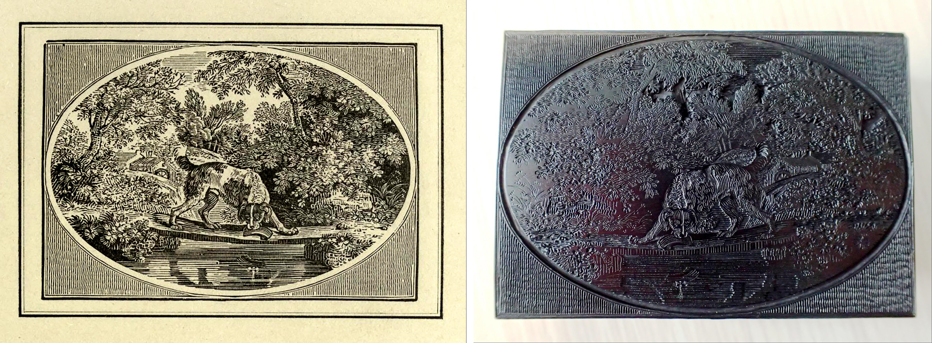 畢維克最著名的白線技法,其實不是他首創,18世紀早期的童書插畫已有不少雕工使用,只是技巧粗糙,而畢維克卻把它高度精緻化到藝術的境界。所謂白線技法,即黑線的反面。自有木雕之始,黑線便是主流,以雕刻而言,刻工必須挖除大量木料,在木板表面只留下細細的黑線是凸出的部分,既費時費力,又不易達到細膩效果;相反,白線是以黑色為背景,刀刻的凹線便是主要線條,就像銅雕版的線條一樣,容易細緻。1818年版的《伊索寓言與其他》就是大量使用白線技法的作品,以「狗與倒影」的主插圖【圖10】為例,圖中口啣偷來的肉塊、卻想搶水中倒影那塊肉的狗兒,站在獨木橋上,是畫裡唯一的角色。比較另一本較早出版的《伊索寓言》【圖9】,可以看出畢維克其實是採用別人的構圖,加以精緻化。在版權觀念薄弱的18世紀,互相抄襲的現象所在多有,出版業與版畫尤其如此,銷路關鍵在於雕工與印製的好壞。1786年版的無名雕刻家已經用了不少白線技法,尤其是邊框橢圓與方框中間的垂直線條;畢維克則是近乎全面採用白線,在黑色背景上,以刀代筆的概念。觀察它的原木雕版面【圖11】,可以看出畢維克刻去的木料極少,卻是刀刀講究,無一失誤。