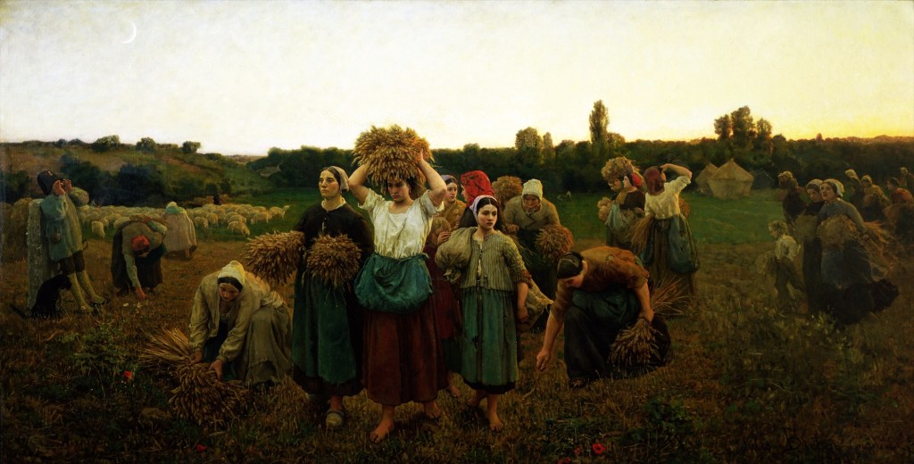 以李梅樹(1902-1983)為例,戰後民國37年(1948),他以家人為肖像,描繪農村勞動女性《黃昏》一作。無論是畫意或構圖(前排直立的女子),該作都受到朱爾斯.布荷東(Jules Breton, 1827-1906)的《拾穗者的呼喚》(Le rappel des glaneuses, 1859)影響。