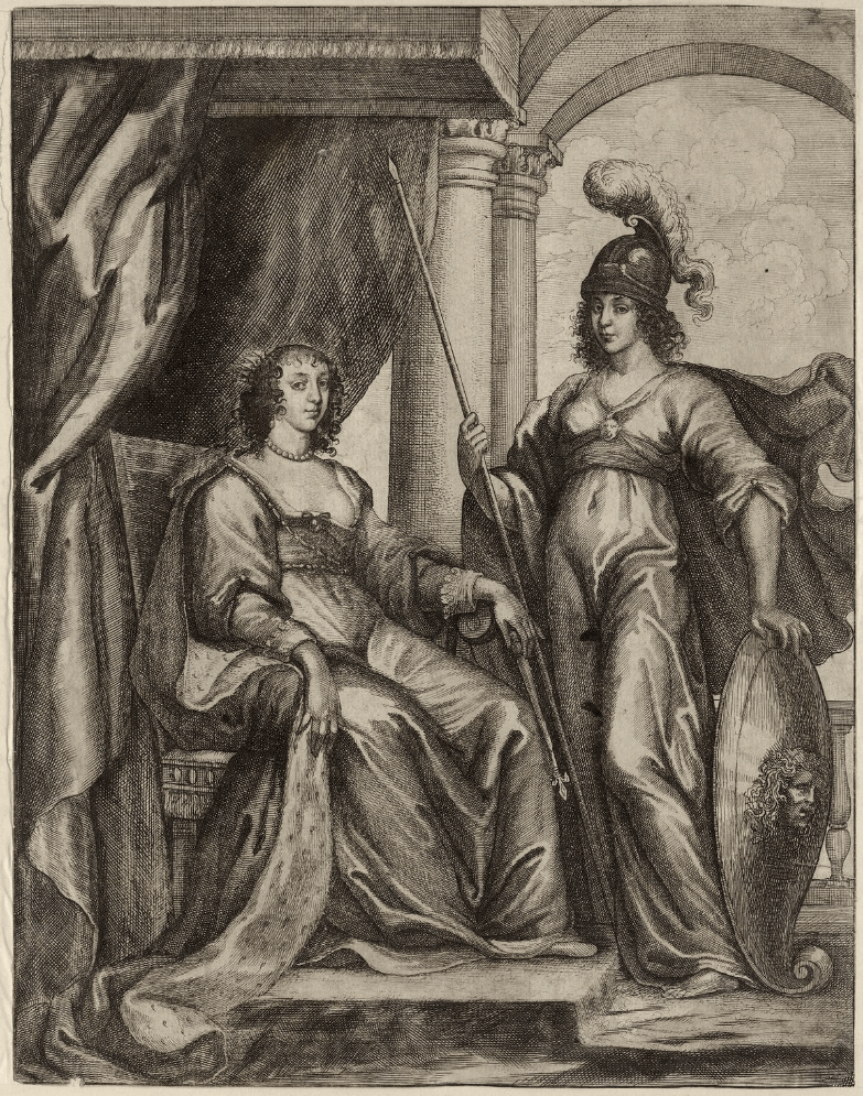 相似的例子還有查理一世(Charles I)皇后亨麗埃塔・瑪麗亞(Henrietta Maria of France)的一幅肖像畫【圖5】,延續並置畫中人物與米聶娃的先例,表明皇后兼具智慧與力量。