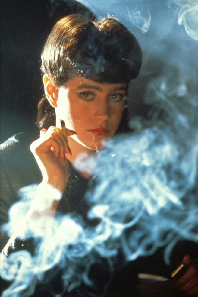 瑞秋的臉部特寫更暗示它的雙重角色。右頰銳利的邊緣光將它與周圍的一切區隔開來,臉部輪廓宛如雕像,是身份無懈可擊?還是完美到不自然?然而她左臉卻落入神秘的陰影中,有如具致命吸引力的女性(Femme fatale)。接受質詢時,瑞秋指稍的香煙冒出裊裊濃煙,掩蓋了它的表情,模糊了答案的可信度【圖3】,也模糊了人與仿生人的差異。