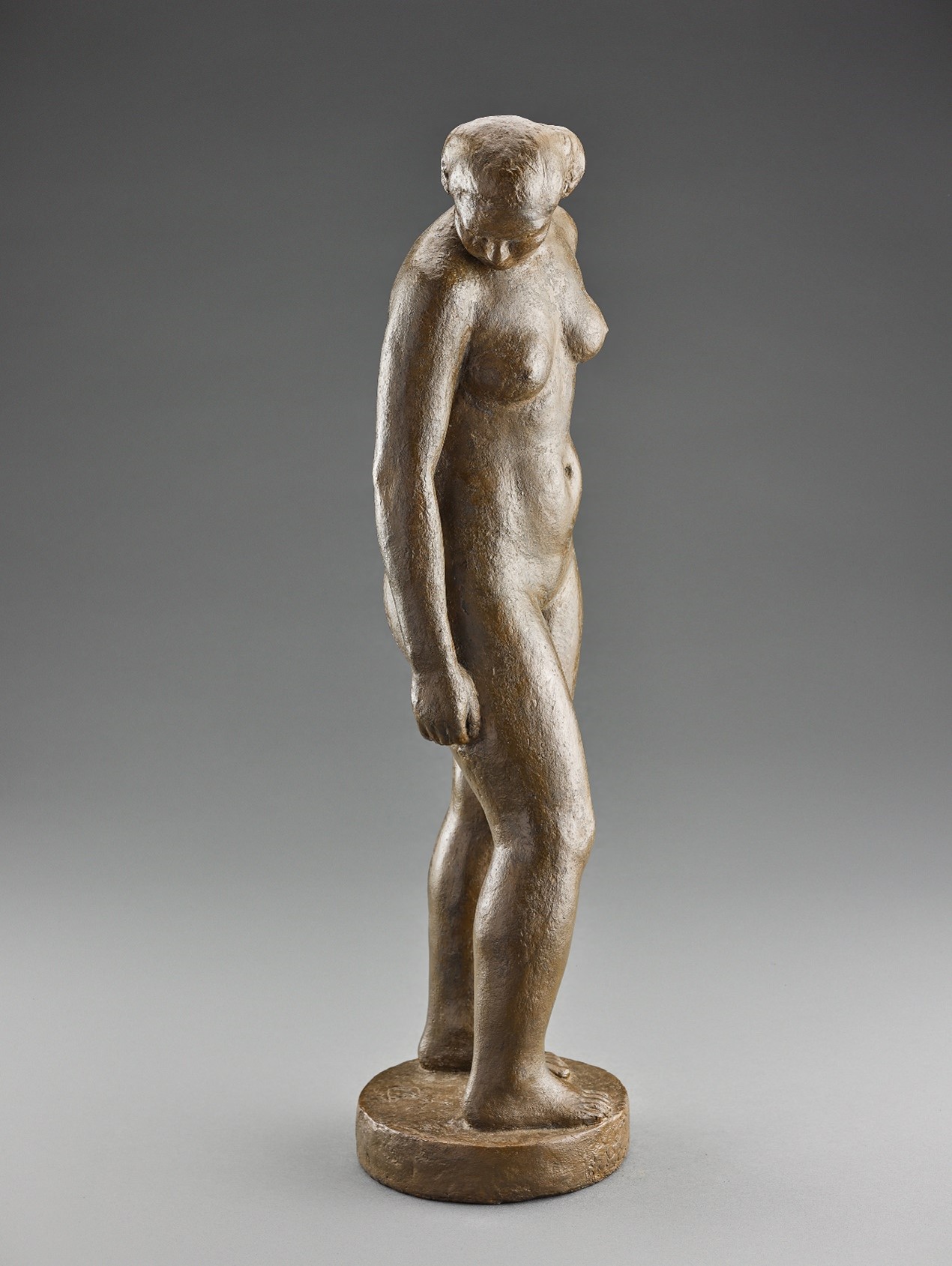 其次,臺灣社會整體的美學觀尚未成熟。西洋藝術中的裸女圖像應該如何看待?是否適合公開陳列觀賞?當時臺灣觀眾,不論臺、日人,對這類問題大多持保守態度。誠如《臺灣美術兩百年》第二章導論〈現代美術與展覽會〉所言,1927年首回臺展時,審查員鹽月桃甫(1886-1954)特意開風氣之先,以裸女為題材,製作《夏》,理由是這類題材在臺灣很少見。不過,當時畫家很謹慎地用一塊布遮掩模特兒的臀部與私處【圖3】。到1936年,李石樵(1908-1995)兩件作品,《橫臥裸婦》與《屏風與裸婦》在臺北參加臺陽畫展時,因為沒有遮蓋私處,仍被總督府官員認為有礙風化,立即撤下。[7] 即使到1989年筆者採訪雕刻家陳夏雨(1915-2000)時,他曾提到幾年前國父紀念館拒絕他的個展,說該館「不能展出裸體作品」。[8]【圖4】